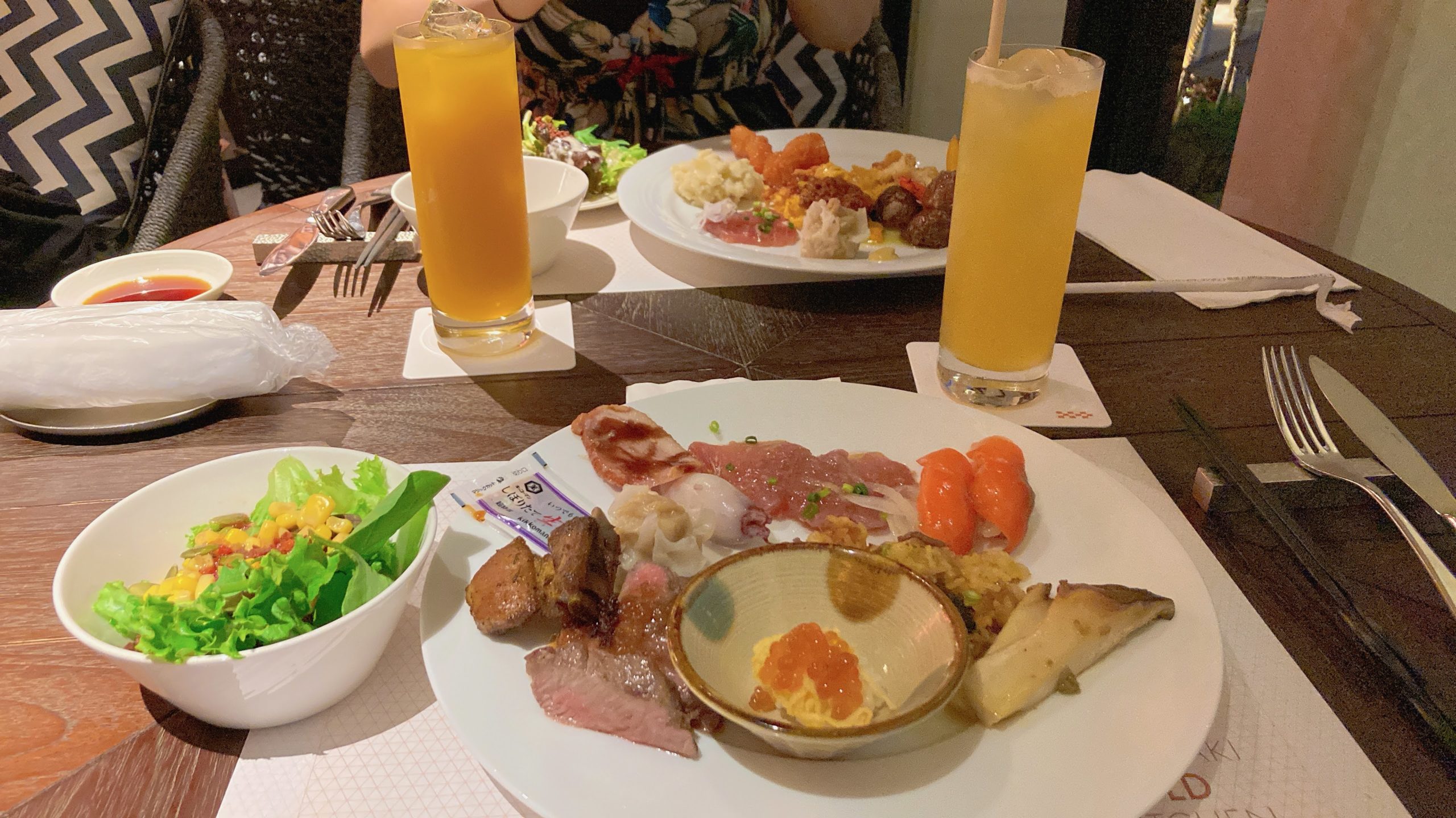 夕食のブッフェです。スパークリングワインをフルーツジュースに変更してもらいました。